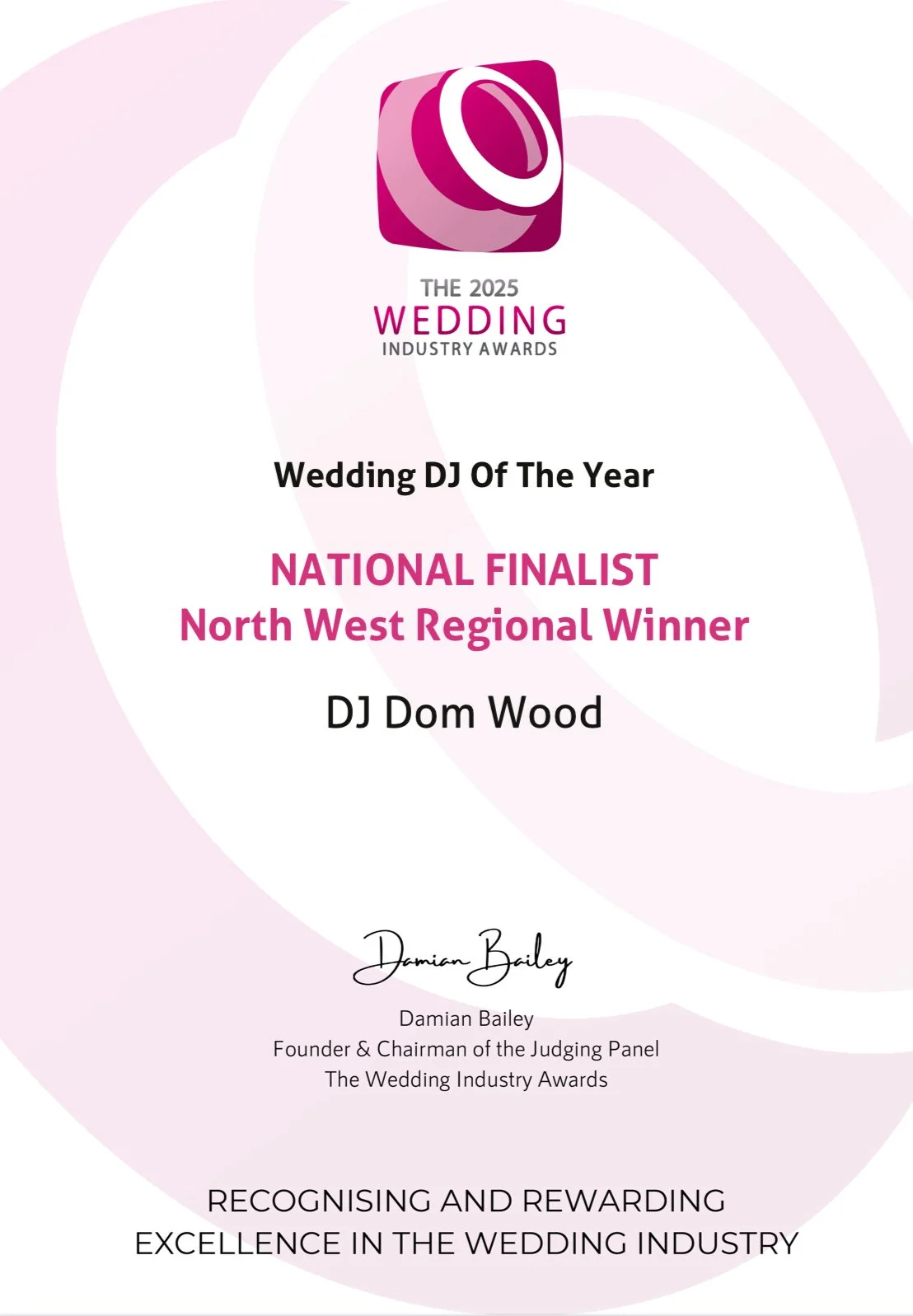 The perfect choice to elevate your wedding or special event! With over eight years of professional DJ experience, Dom brings a blend of expertise and passion to every performance. Recently recognized as a regional finalist in the Northwest category for "Entertainment DJ of the Year" in 2023, and again as a finalist for "Wedding DJ of the Year" in 2024, Dom proudly won his first major award, TWIA’s "Wedding DJ of the Year" for the Northwest region. Thanks to his recent success in the industry, Dom’s popularity is increasingly growing and has become one of the most in demand DJs in Greater Manchester and Cheshire! He is now a recommended supplier at 8 prestigious venues across the Northwest. Recognition that reflects not only his music but also the professionalism and care he brings to every wedding.
